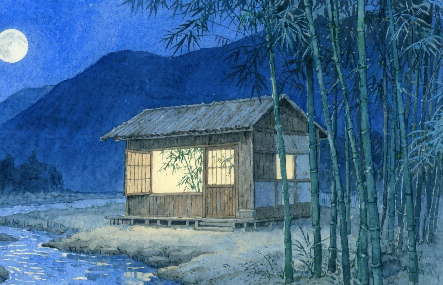 The mountain moon, like a piece of warm jade, is immersed in the ink-blue sky. You lie in a small wooden house…