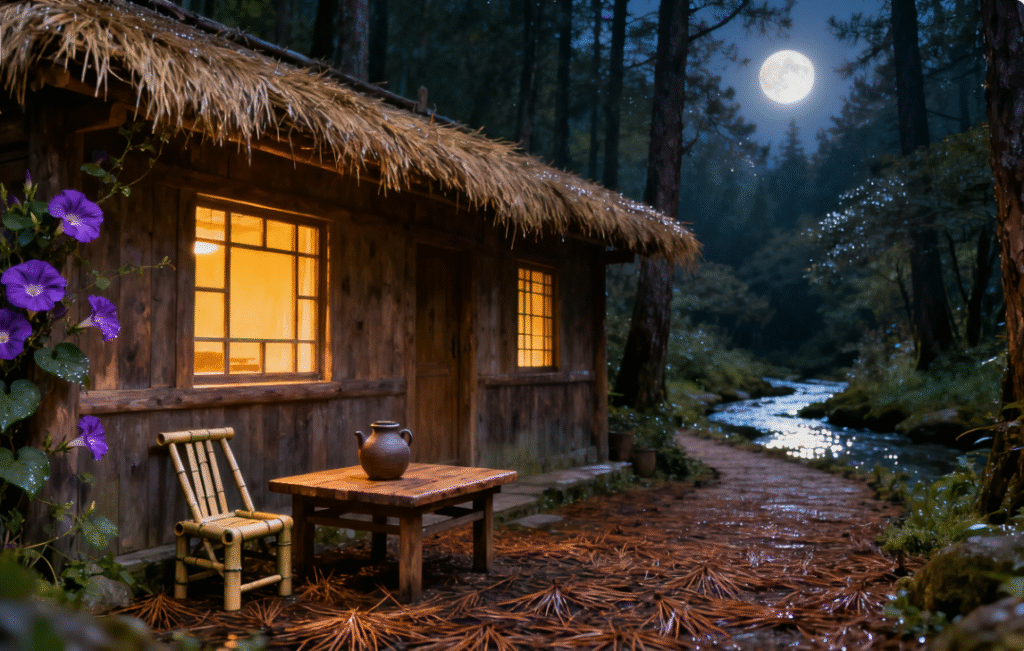 After walking for about a quarter of an hour, the outline of the forest cabin gradually came into view. It was a small wooden house built from logs, with a thatched roof dried in the sun. Several pale purple morning glories twined around the corner, their petals still dotted with afternoon dew that glimmered faintly in the dusk. In the open space in front of the house, an old wooden table and two bamboo chairs were placed, with a rough earthenware kettle printed with faint wood grains on the table.​